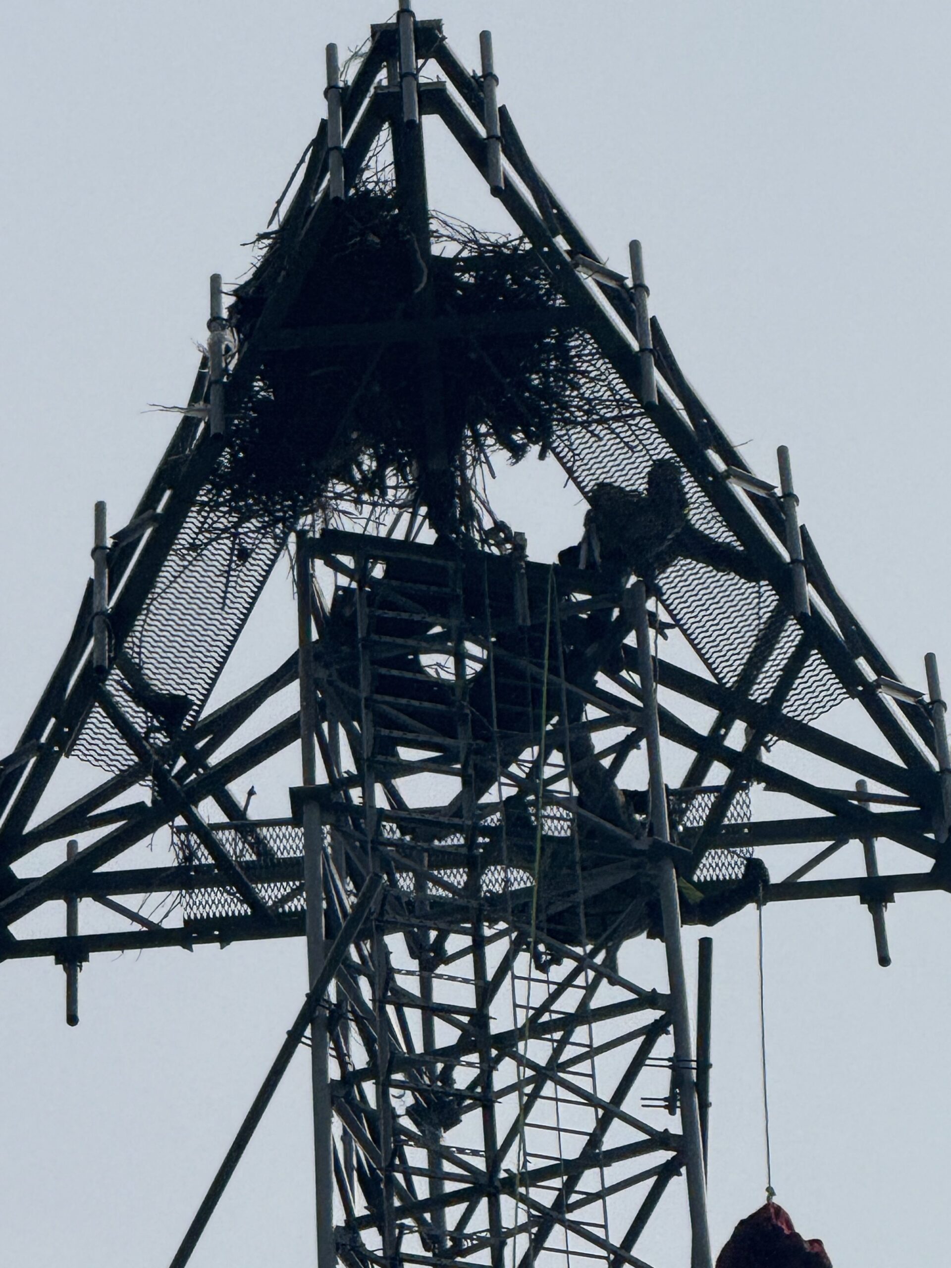 On August 22nd, Cedar Falls Fire Rescue responded to a report of an injured eagle on a cell tower along W 27th Street. Video from a drone operated by a citizen showed an osprey dangling upside down by one foot, unable to dislodge a trapped talon from the structure. The osprey was located approximately 195 feet at the top of the tower where the it had created a nesting area. Cedar Falls Fire Rescue notified the tower owner and initially received permission to access the tower. Crews prepared to make the rescue at the cell tower as the owner activated their own crew that services that equipment to respond and requested that Cedar Falls personnel stay on scene to support their operation but let their crew scale the structure.