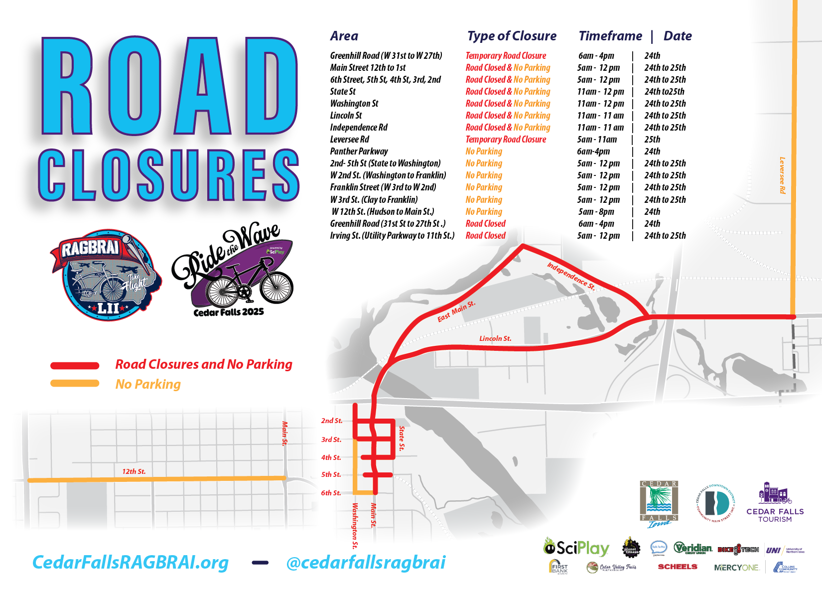 Cedar Falls is excited to welcome RAGBRAI on Thursday, July 24! As an overnight town, the city is expected to see a heavy increase in bike and pedestrian traffic. Activities for the event will be in the Cedar Falls Downtown area, but the public should also be alert for increased traffic as cyclists will be staying at host sites throughout the area. Residents are encouraged to familiarize themselves with the route and road closures, as well as City facility updated operating hours, so they can stay safe and plan ahead.