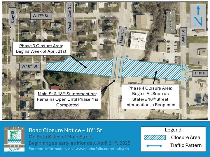 There are two parts to this closure: Phase 3 (Washington to Main) will commence first, while Phase 4 (Main to State) will commence once the intersection work at State/East 18th Street is completed (approximately one week after Phase 3 starts). Residential and business access will be maintained via Main Street, Washington Street, and State Street.
