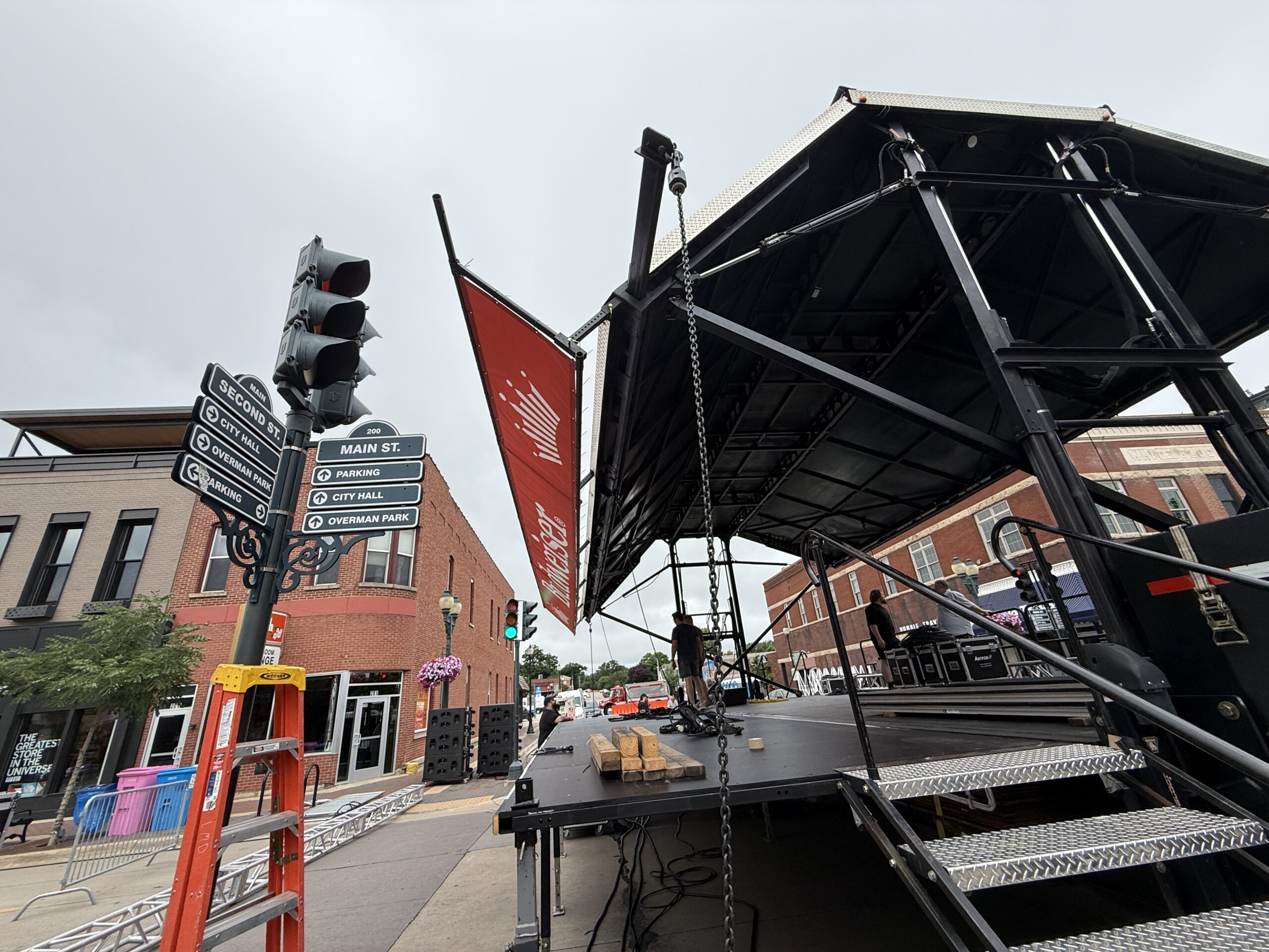 The busiest space on Friday morning was around Second Street, where the Main Stage was coming together.